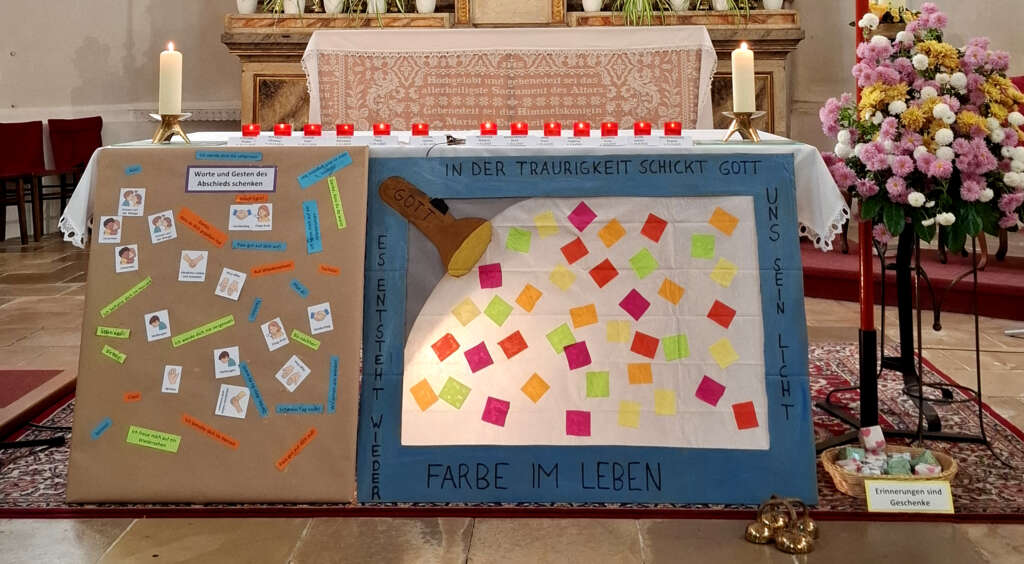 An fünf Stationen erfuhren die Kinder, wie Abschiednehmen sein kann – manchmal kurz, manchmal lang, manchmal für immer. Sie lernten, dass Traurigkeit, Wut oder stille Gedanken dazugehören und dass Gott alle Gefühle versteht und bei uns ist. Mit kreativen Aktionen wie dem Gestalten von Erinnerungsgeschenken und dem Basteln eines bunten Lichtstrahls konnten die Kinder ihre Gefühle ausdrücken. Der Lichtstrahl symbolisierte, dass Gott in der Traurigkeit sein Licht schickt und dass dadurch wieder Farbe ins Leben kommt.