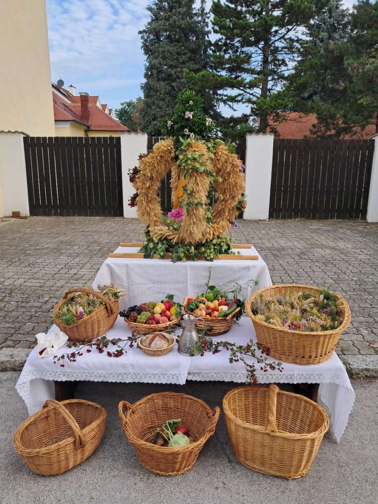 Fleißige Frauen aus unserer Pfarre haben dankenswerterweise wieder ihre liebevoll gebundenen Erntesträußchen an die Messbesucher verteilt. Bevor diese den Nachhauseweg antraten, durfte sich jeder aus den vollen Früchtekörben bedienen, um – wie von Pfarrer Michael angeregt – beim gemeinsamen Gebet am Mittagstisch dafür zu danken und mit seinen Lieben zu teilen.