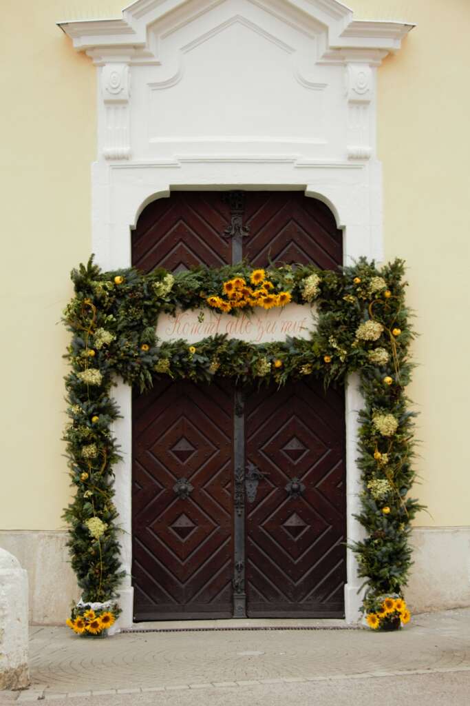 Vor dem Haupteingang machte man mit der Erntekrone Halt.