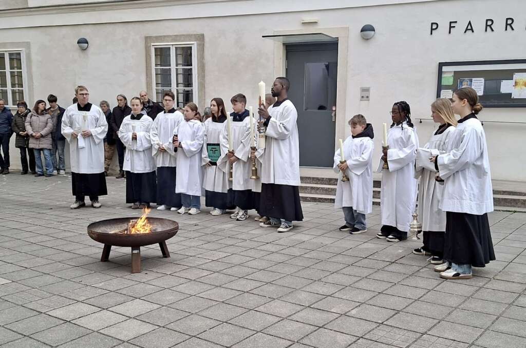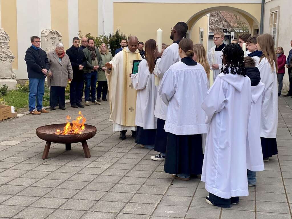 Die Auferstehungsfeier am Karsamstag begingen wir mit Kaplan Clement. Die Osterkerze wurde beim Osterfeuer gesegnet und in die Kirche gebracht.