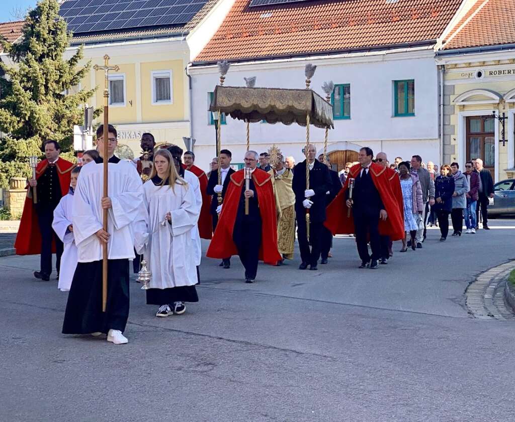 Der Ostersonntag begann mit der Auferstehungsprozession mit dem Allerheiligsten und dem Auferstandenen rund um den Hauptplatz bevor wir den Ostergottesdienst mit Pfarrer Michael Wagner feierten. Begleitet wurde die Prozession von der Blasmusik Göllersdorf.