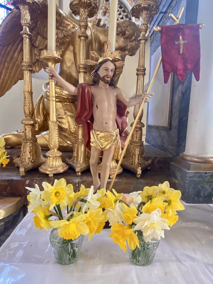 Zur Kreuzverehrung wurden wieder Blumen mitgebracht, die von den Frauen im Anschluss für den Grabschmuck gesteckt wurden. Das Heilige Grab war für die Anbetung am Vormittag des Karsamstags bereitet.
