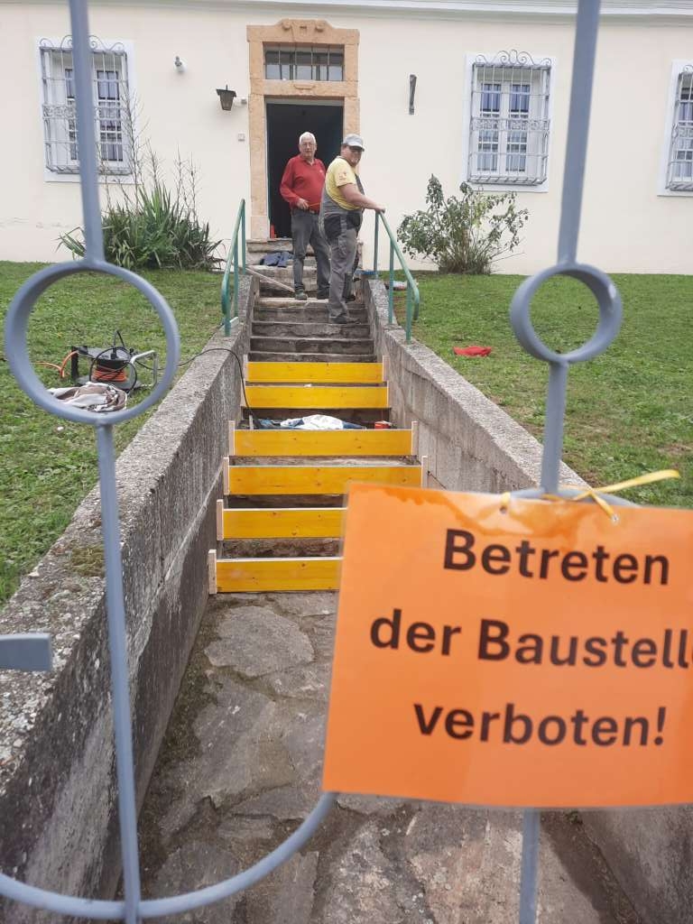 Nachdem sich die Natursteinplatten bei den Eingangsstiegen zum Pfarrhof gelockert haben, mussten sie renoviert werden. Es wurden zuerst die losen Platten entfernt, bevor man mit den Schalungsarbeiten beginnen konnte.